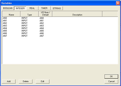 Note: When placing variables for functions, generally the output and input types must match (if an integer is selected as P1, then the other inputs and the outputs are locked to an integer type except for specific instances). When variables are inserted near functions, only the first variable placed may allow the selection of the type of variable (integer / real / boolean). Any addtional placements of variables to the same function will be limited to the first variable type (the other type "tabs" are not available).