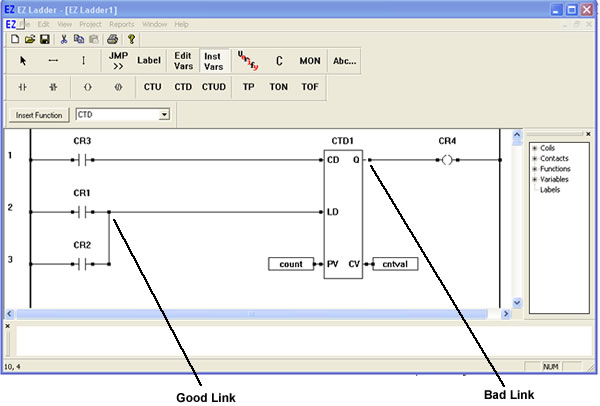 As seen in our open ladder diagram, it is simple to draw links between objects. It is possible to draw a link that does not connect to the object. This is called an open or incomplete link. If one of these open links exists in the ladder diagram, it cannot compile until the link error is corrected. Below is a typical ladder diagram showing good links and bad links.