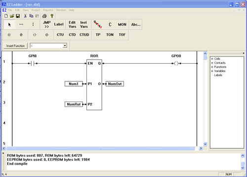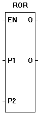 The ROR function provides a right-bit rotation of the P1 input. P2 specifies the number of one-bit rotations. The P1 number is a integer representation of a binary number. The P2 number is an integer representation of the number of binary rotations (shifts) to occur to P1. The actual bit only rotates when the minimum number is reached (example: 32 bit rotation to the input number 32). The enable (EN) must be true for the ROR function to be enabled. The Q output is true when the ROR function is enabled. The O Output is the rotated number (represented in integer form). |