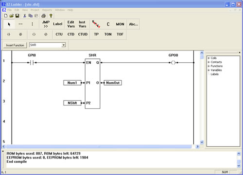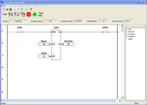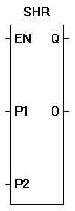 The SHR function provides a right bit shift of the P1 input. The P2 input specifies the number of one-bit right shifts. If the enable (EN) is false, the function is disabled. If the enable (EN) is true, the output (O) will be equal result of the right shifted input in integer form (32..16..8..4..2..1). A shift right when the output is 1 will cause the output to be zero (bit is shifted off). Zeros are always shifted on to the left side when a right shift occurs.