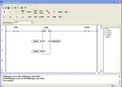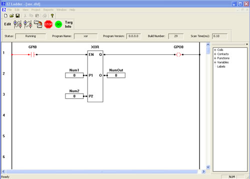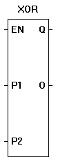 The XOR functions provides a bitwise exclusive OR function of the P1 and P2 inputs. The enable (EN) must be true for the XOR function to be enabled. The Q output is true when the XOR function is enabled. |