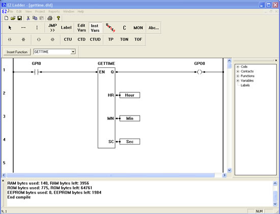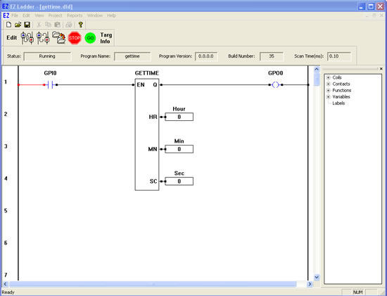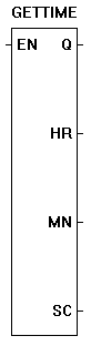 The GETTIME function reads the current time from the hardware real time clock. The values of the time are stored into the integer variables on the ouputs. The enable (EN) must be true for the GETTIME function to be enabled. |